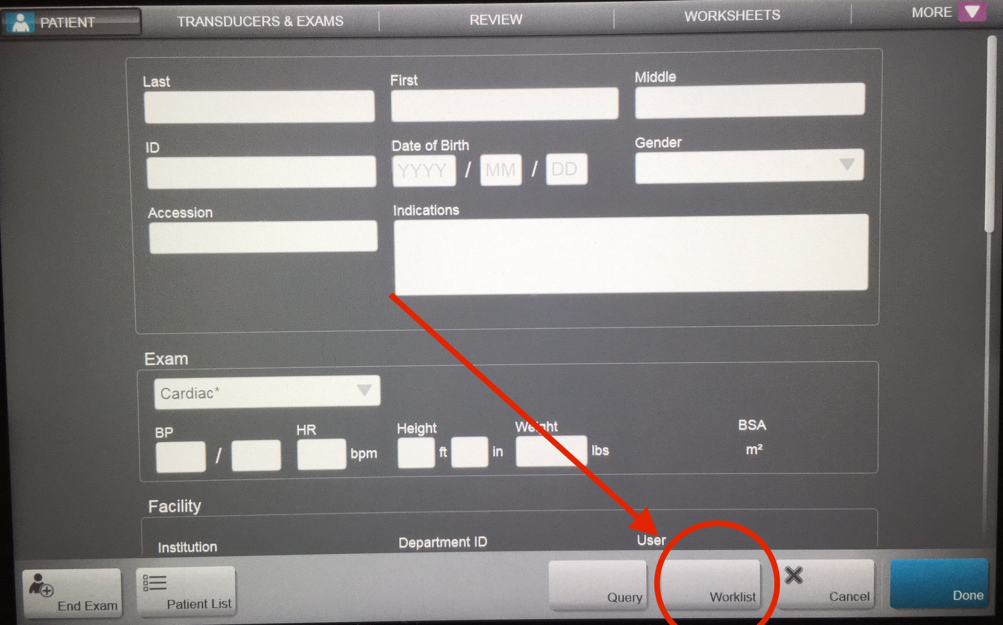 3. This will auto-populate patient demographic info into the machine. You must add your qpath username to the reading doctor field (for residents) or referring doctor field (for attendings):